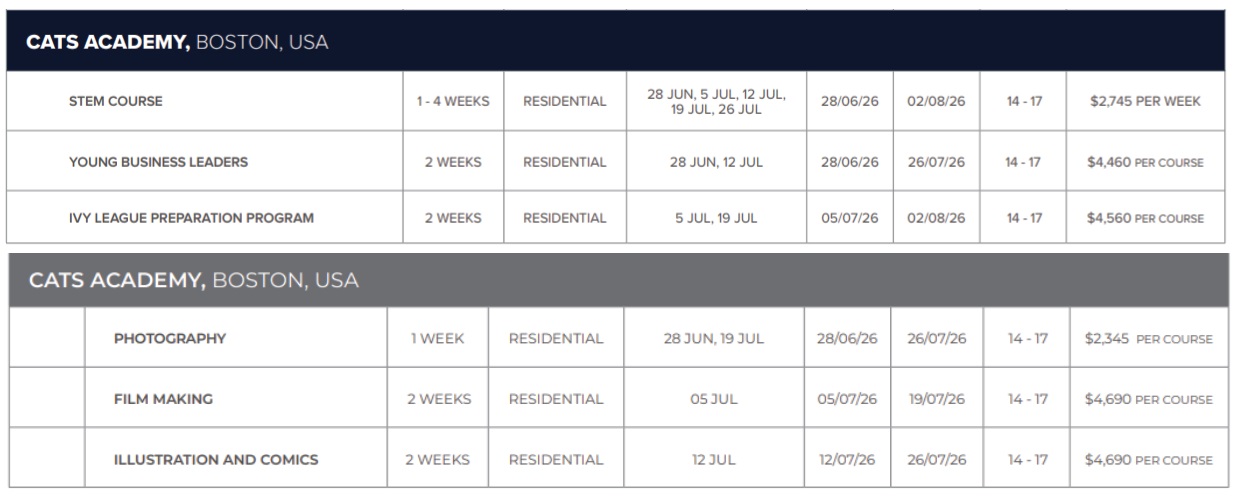 CATS Academy, dünyaca ünlü üniversite şehri olan Boston şehir merkezine 20 dakika uzaklıkta yer alan Braintree’de bulunmaktadır. Okul tarafından 14-17 yaş grubu öğrencilere yönelik akademik yaz okulu programları düzenlemektedir. Ivy League Preparation, STEM ve Young Business Leaders program seçenekleri mevcuttur. Programa katılacak öğrencilerin İngilizce seviyelerinin iyi düzeyde olması gerekir.