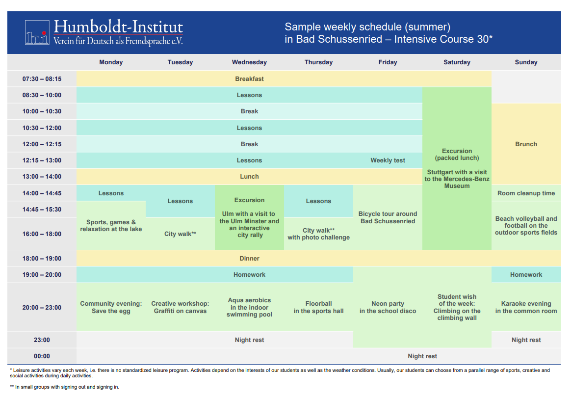 Humboldt-Institut Bad Schussenried yaz okulu programına katılan öğrenciler okul yurdundaki 2-3 kişilik duşlu, tuvaletli odalarda tam pansiyon esasına göre kalırlar. Aynı dili konuşan öğrencilerin birlikte kalmalarına izin verilmez. Öğrencilerin çamaşırları haftada bir kez okul tarafından yıkanır. Program başlangıcında pasaport ve harçlıklar okul kasasına teslim edilir. Wi-Fi öğrencilerin kullanımına açıktır. Öğrencilerden okula vardıklarında €50 zarar-ziyan depozitosu alınır.