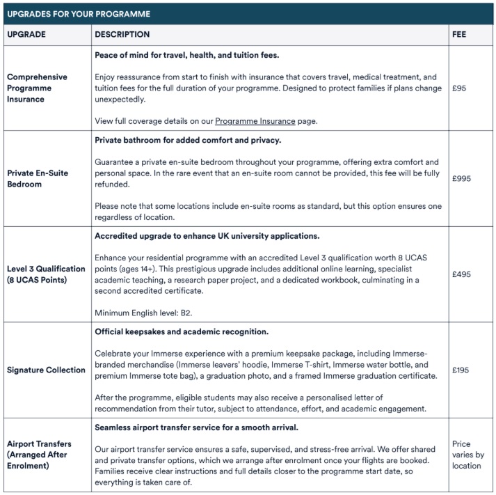 Ekstralar: | Signature Collection £195 Level 3 Qualification (8 UCAS Puanı) £495 Özel Banyolu Oda Farkı £995 Ekstraların detaylarını görmek için lütfen tıklayınız. |